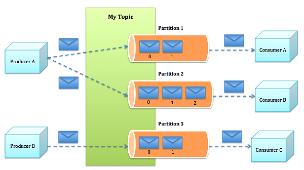 Un topic Kafka est regroupé en plusieurs partitions pour l'évolutivité ( Nous pouvons faire evolué notre système kafka horizontalepment en rajoutant des partitions ). Chaque partition est une séquence de messages ( Array de messages - tableau de bytes plus exactement) qui sont continuellement ajoutés. Un index unique séquentiel appelé offset est attribué à chaque message dans la partition , pour que les memes messages soient envoyés vers la même partion , un hash sur la clé du message modulo le nombre de partition pour envoyer le message.